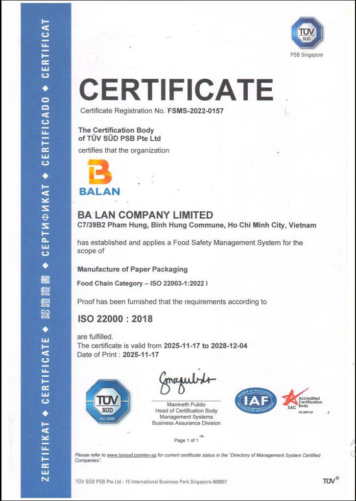 Đây là minh chứng rõ ràng cho năng lực sản xuất bao bì an toàn, phù hợp để sản xuất bao bì thực phẩm, dược phẩm theo tiêu chuẩn quốc tế.
